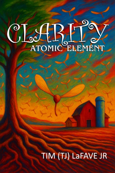 The cover art of Clarity: Atomic Element ties the two previous collections together with the large maple tree and the generation of “helicopter seeds” like photons of light that are emitted by atoms. The title suggests this process of generating photons of light as well as the maintenance of a person’s identity (“atomic” from Greek words meaning “uncuttable” and “indivisible”).